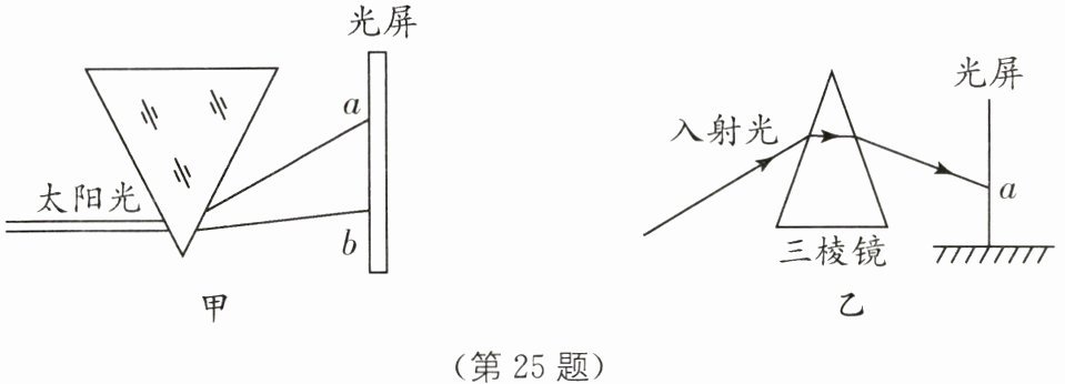 25.(8分)变式提优→B卷T24(2024·宿迁沭阳县月考)如图甲所示,一束太阳光通过三棱镜射到光屏上.