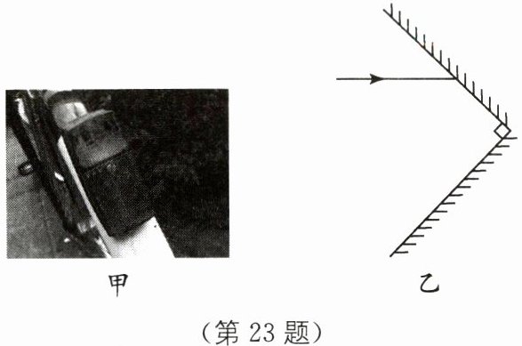 23.(2分)(2024·无锡期末)自行车尾灯是由许多相互垂直的小平面镜构成.如图甲所示,图乙为其两个平面镜的简化示意图.请在图乙中画出入射光依次经过这两个平面镜的反射光路图.