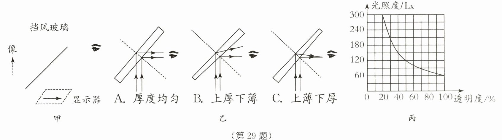 (填写字母)图所示的玻璃.(4)"智能玻璃"能根据车外光照度自动调节玻璃的透明度,如图丙所示,当车外光照度为500 Lx时,"智能玻璃"的透明度会自动调节约为