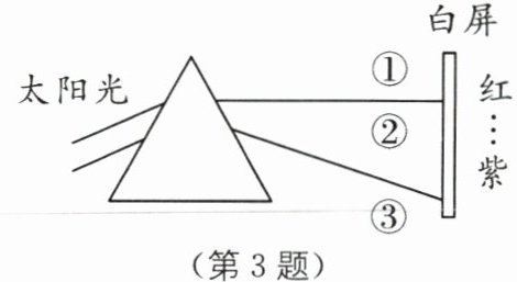 3.如图所示,让一束太阳光照射三棱镜,射出的光照到竖直放置的白屏上,屏上标出的三个区域,其中②区域是彩色光带。研究此现象,以下说法错误的是(