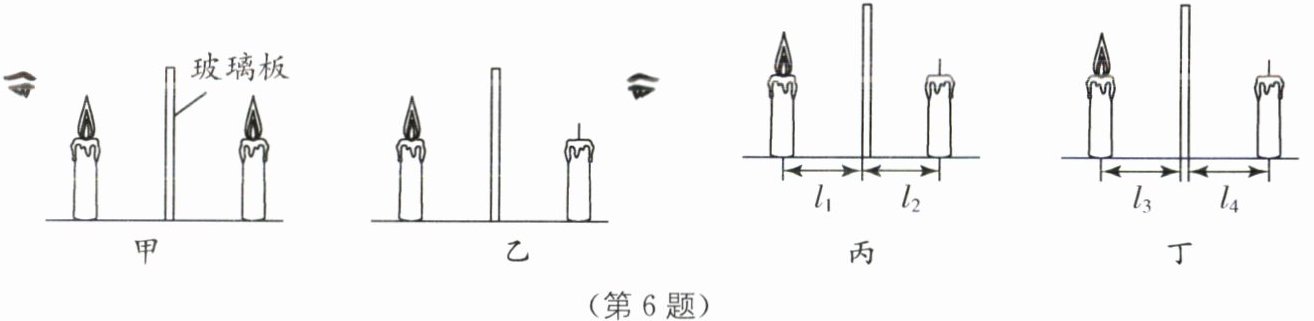 C [解析]图甲:确定像的位置时,为成像更清晰,玻璃板后的蜡烛应不点燃,故A不符合题意.图乙:观察点燃蜡烛的像的大小,平面镜成像是由光的反射形成的,应在点燃的蜡烛一侧观察,故B不符合题意.图丙和图丁:平面镜成像中,像与物关于平面镜对称,像距等于物距,测量像距和物距时;应选择平面镜靠近点燃蜡烛的一侧表面作为反射面,故C符合题意,D不符合题意.