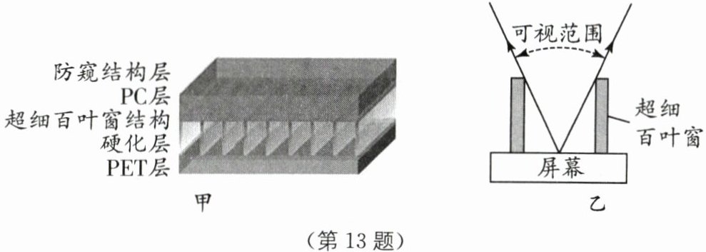 (填“是”或“不是”)光源。如图甲所示为手机防窥膜结构图,目前市面上的防窥膜,主要都采用了超细百叶窗光学技术。就像生活中的百叶窗借助叶片的凹凸方向,实现采光的同时阻挡外界视线。防窥膜的技术与其相似。手机贴上防窥膜后,正在使用手机的人能够在正面90度下,清晰地观看屏幕显示内容,但左右小于特定度数,如25度、45度的侧面就无法看到屏幕的内容。手机防窥膜结构简图如图乙所示,两侧之所以看不清屏幕内容,是由于光的直线传播