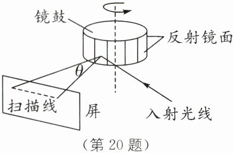 20.为了连续改变反射光的方向,并多次重复这个过程,方法之一是旋转由许多反射镜面组成的多面体棱镜(简称镜鼓),如图所示。当激光束以固定方向入射到镜鼓的一个反射面上时,由于反射镜绕竖直轴旋转,反射光就可在屏幕上扫出一条水平线。每块反射镜都将轮流扫描一次。如果要求扫描的范围θ= 45°且每秒钟扫描48次,那么镜鼓的反射镜面数目是