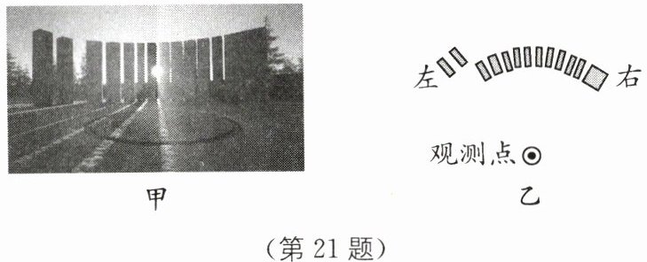 21.(1分)图甲是世界最早的观象台——山西陶寺古观象台,它由13根半圆形排列的夯土柱和观测台组成。站在观测台中心观测日出,若从右侧第二个狭缝观察到太阳,这一天就是冬至日;若从左侧第1个狭缝观察到太阳,这一天就是夏至日。请在图乙对应的结构示意图中,画出冬至日或夏至日观测者看到太阳的光路图。