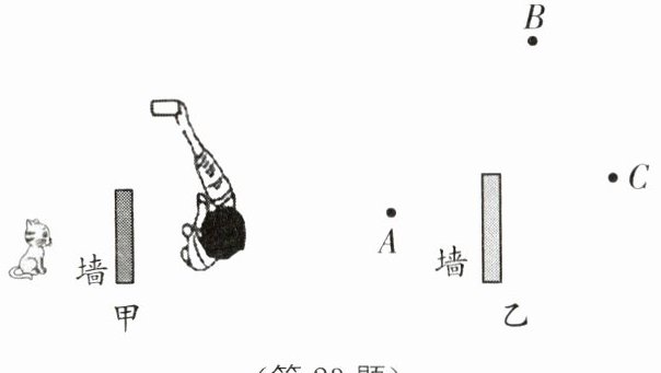 23.(2分)图甲中小美正利用一面小镜子隔墙观察小猫。图乙中A点表示小猫的位置,B点表示平面镜上入射点,C点表示小美眼睛所在位置。请在图乙中完成小美隔墙观察小猫的光路并标出平面镜的位置。