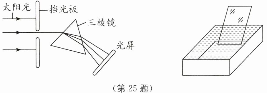 (6)一个长方形水槽中装有一定量的水,小明将一块平面镜斜插入水槽中,使太阳光照射在平面镜上,并反射到白色墙壁或白纸上,也可以看到彩色光带,此时平面镜上方的水类似于