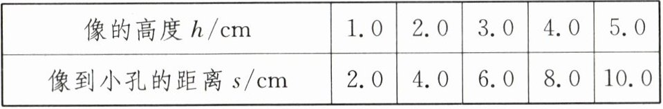 (3)还发现蜡烛和小孔的位置固定后,像离小孔越远,像就越大。他测出了不同距离时像的高度,并将实验结果填在了表格中,根据表中的数据可以得到的结论是蜡烛和小孔的位置固定后,像的高度h与像到小孔的距离s关系表达式为h=