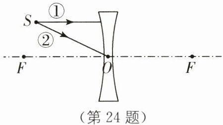 24. (2分)(2024·大庆中考)如图所示,光源S发出的两条光线射向凹透镜,其中光线①平行于主光轴,光线②经过光心,画出它们经过凹透镜的折射光线.(保留必要的作图痕迹)