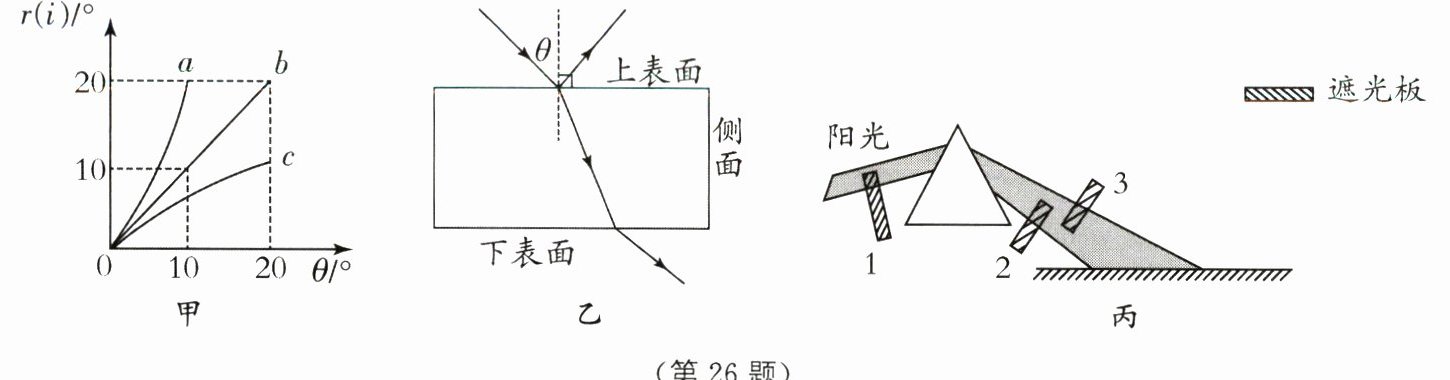 (6)在光的色散现象中,光屏自上而下出现了红、橙、黄、绿、蓝、靛、紫的色带,因为紫光的偏折程度最大,在光屏的最左侧,所以图丙中第3种遮挡方法最有可能得到紫光。