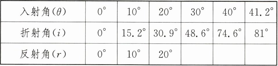 (2)在光的反射现象中,反射角等于入射角,则表中余下的反射角的三个数据分别是30°、40°、41.2°。