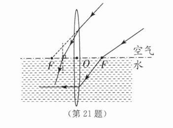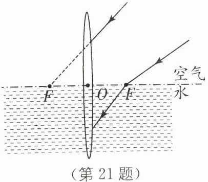 21. (2分)如图所示,将凸透镜一半浸入水中,两条光线射向透镜(F为凸透镜在水中的焦点),请完成光路.