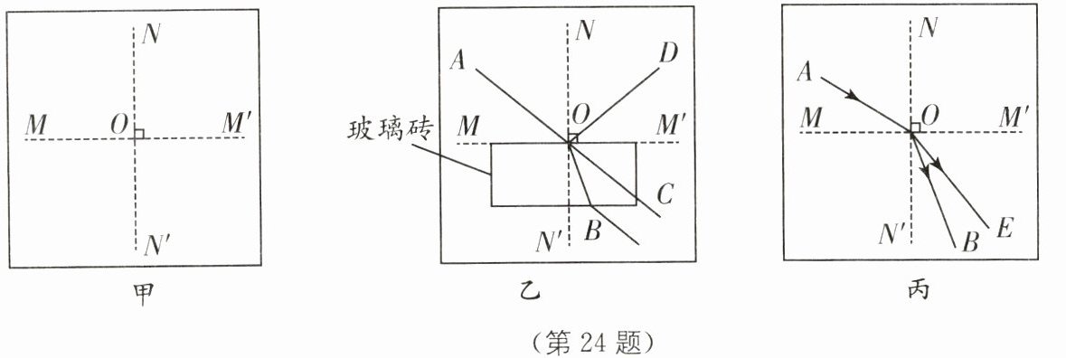 24. (11分) 比较法 光从空气斜射入水和玻璃时都会发生折射现象,但是水和玻璃的折射情况会相同吗?为了探究这个问题,小华选择了光屏、透明玻璃砖、水槽、激光电筒等器材进行实验.他在光屏上画出互相垂直的NN'和MM'两条线段并相交于O点,如图甲所示.
