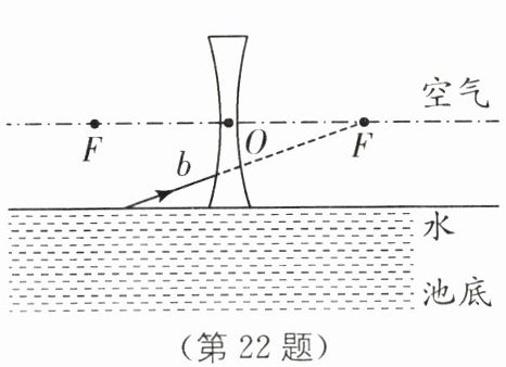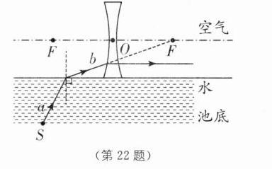 22. (4分)如图所示,光线b是水池底部一光源S发出的光线a经水面折射后的折射光线,并射向凹透镜的焦点F.请画出: