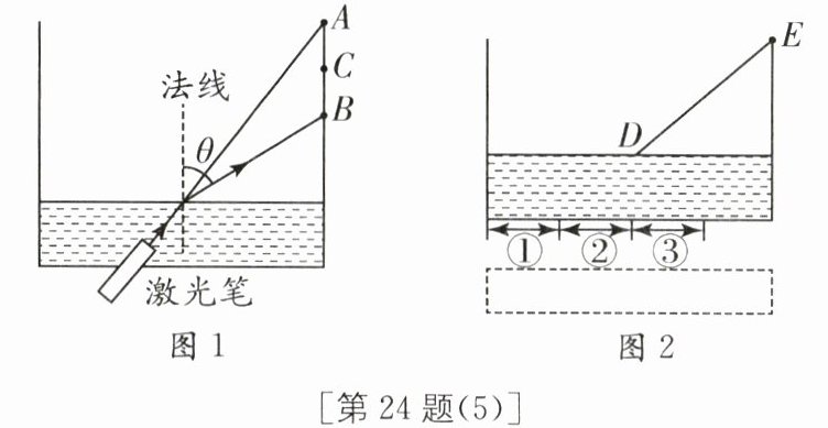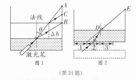 (7)如图2所示,小彬将激光笔移至虚线框内向水槽底部照射,为使光束第一次从水面射出后沿DE方向传播,则激光笔照射的方向应满足的条件是________,且激光笔照射在水槽底部的位置必须在区域________(填"①""②"或"③")内.