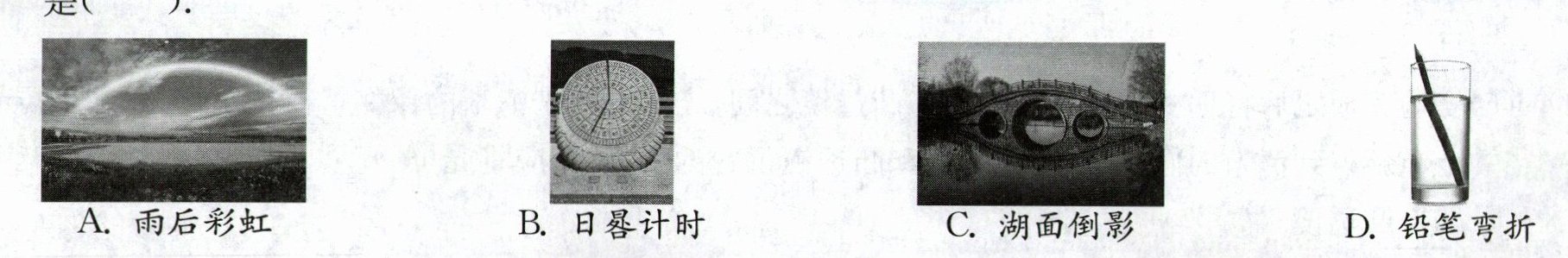 B [解析]小孔成像表明光在同种均匀介质中是沿直线传播的.雨后彩虹,属于光的色散,故A不符合题意;日晷计时,利用光在同种均匀物质中沿直线传播,故B符合题意;湖面倒影属于光的反射,故C不符合题意;铅笔弯折,属于光的折射,故D不符合题意.