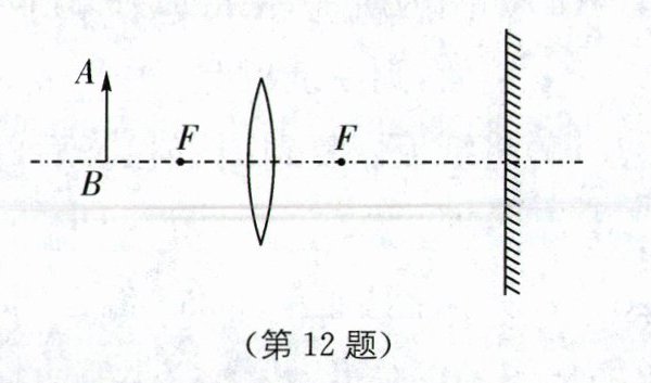 12. 如图所示,凸透镜的焦距为 5 cm,在透镜左侧 10 cm 处,有一个与主光轴垂直的物体 AB,在透镜右侧 15 cm 处放一个平面镜,镜面与凸透镜的主光轴垂直,则该光具组中,物体 AB 的成像情况是( ).