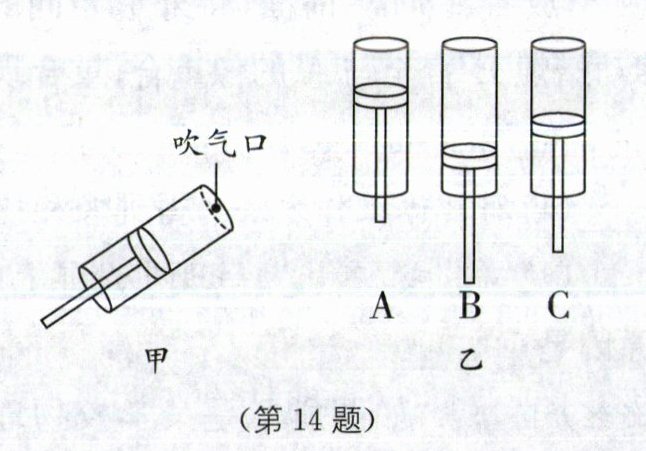 14. 小丽制作了如图甲所示的哨子,向吹气口吹气哨子发出声音,哨声是由管内的