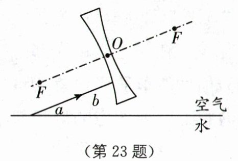 23. (3 分)如图所示,由水中折射出的一条光线 ab 照射到凹透镜上,光线 ab 与凹透镜的主光轴平行.已知 F 为凹透镜的虚焦点,O 为光心.请画出: