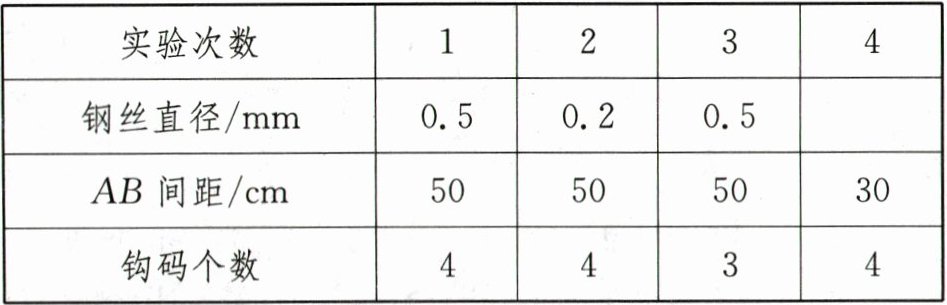 (4)结合控制变量法分析,两组数据中只能有一个变量,因此结合前三组数据可知第4次钢丝应选择$0.5\ mm^2$的.