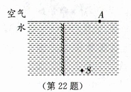 22. (3 分)如图所示,水中一激光灯 S 发出的一束光,经水中平面镜反射后从水面的 A 点射出,请完成下列作图并保留作图痕迹: