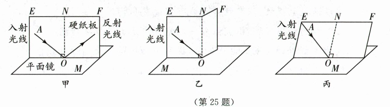 (4)如图丙所示,保持 E、F 在同一平面内,将硬纸板倾斜,让入射光线仍贴着硬纸板沿 AO 方向射向镜面,则硬纸板上