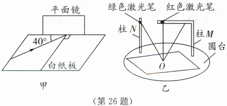 26. (5 分)小明"探究光的反射规律"装置如图甲所示,白纸板放在水平桌面上,再将一块平面镜竖直放在纸板上,在纸板上安装一支可自由移动的激光笔,使其发出的光紧贴纸板入射.
