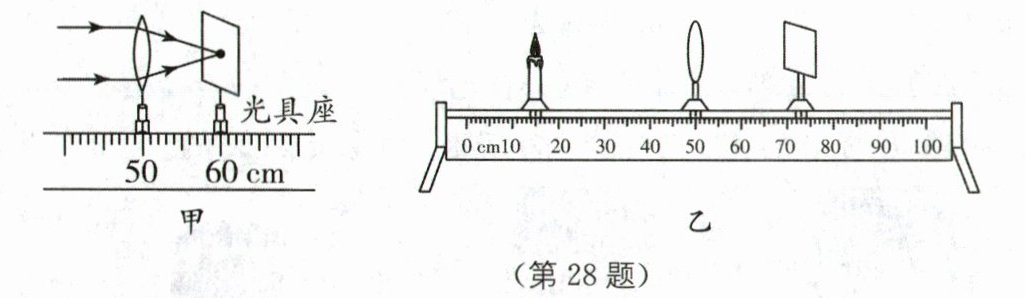 cm.(3)如图乙所示,将凸透镜固定在光具座 50 cm 刻度线处,把点燃的蜡烛放置在光具座 15 cm 处时,若移动光屏,能成倒立、