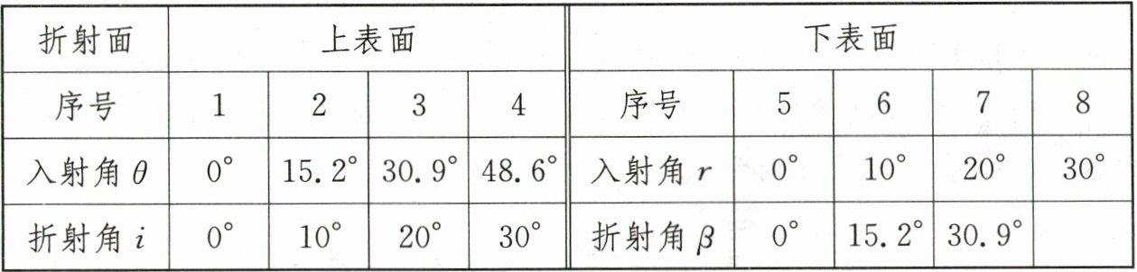 (3)实验过程中,小明多次改变入射角θ,并使每次的入射点始终为 O 点,标记出对应的从下表面射出的 O'点,并在白纸上连接对应的 OO',然后测出从空气射入上表面的入射角θ和折射角 i,从玻璃下表面射入空气的入射角 r 和折射角β.如表所示是记录的实验数据.