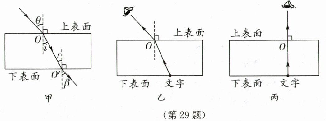 (4)乙 “字”反射的光线由玻璃斜射人空气时发生折射,折射角大于人射角,人眼逆着折射光线看过去,看到的“字”的虚像在“字”的实际位置的上方