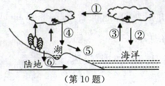 10.C [解析]分析图可知,①为水汽输送,②④为降水,③为蒸发,⑤为地表径流,⑥为地下径流。南水北调工程主要是对地表径流⑤的影响,故A错误;环节③主要是海水汽化(蒸发)成水蒸气上升到空中,故B错误;④为降水,因此人工增雨会改变环节④的时空分布,故C正确;环节⑥为地下径流,可以减慢水分的蒸发,故D错误。