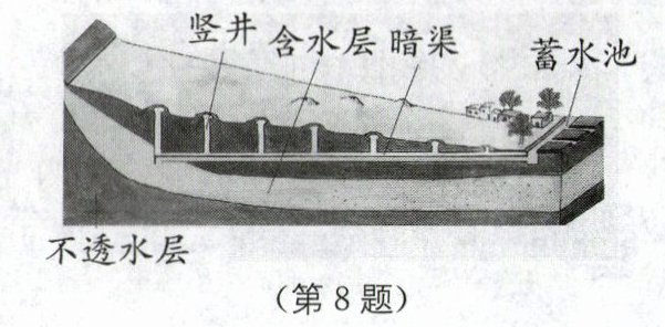 8.C [解析]如图所示为吐鲁番当地使用的“坎儿井”的示意图,暗渠处于地下,减少了水面与空气的接触面积,减慢了水面上方空气的流速,从而可以有效地减慢输水过程中的蒸发,节约水资源。