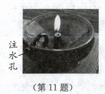 11.空气 水 温度 减慢 [解析]燃灯前,向注水孔缓慢注入冷水,是为了让空气及时排出;因为水蒸发吸热,可以使油的温度较低,减小油的蒸发速度,达到省油的目的。