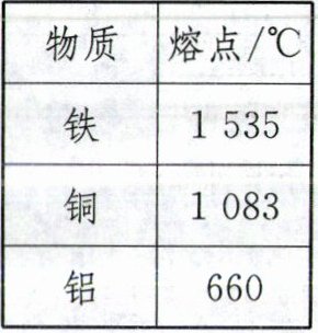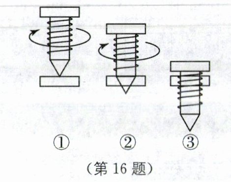 16.熔化 凝固 铝 [解析]②螺钉尖端与板材表面摩擦生热,板材局部会熔化为液态;③螺纹完全拧入板材后螺钉停止转动,板材局部的温度变低,由液态凝固为固态,牢牢套住螺钉;由表格中的数据可知,铜的熔点为$1083^{\circ }C$,而铁的熔点要高于铜的熔点,铝的熔点低于铜的熔点,所以铜螺钉不能拧入铁物质制作的板材,可以拧入铝物质制作的板材。
