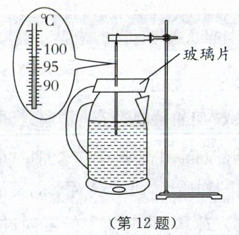 12.98 液化 吸热 [解析]由图可知,温度计的分度值为$1^{\circ }C$,此时温度计的示数为$98^{\circ }C$;玻璃片下表面出现小水珠是水蒸气遇冷液化形成的;停止加热,水不能继续沸腾,这说明水沸腾时需要吸热。