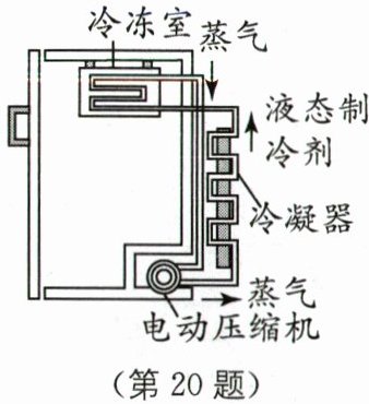20.汽化 液化 [解析]液态制冷剂经过一段很细的毛细管进入冰箱内冷冻室的管子里,液态制冷剂迅速汽化吸热变成气态制冷剂;气态制冷剂到达冷凝器后再放热液化成液态制冷剂,把热量从冰箱内带出来。