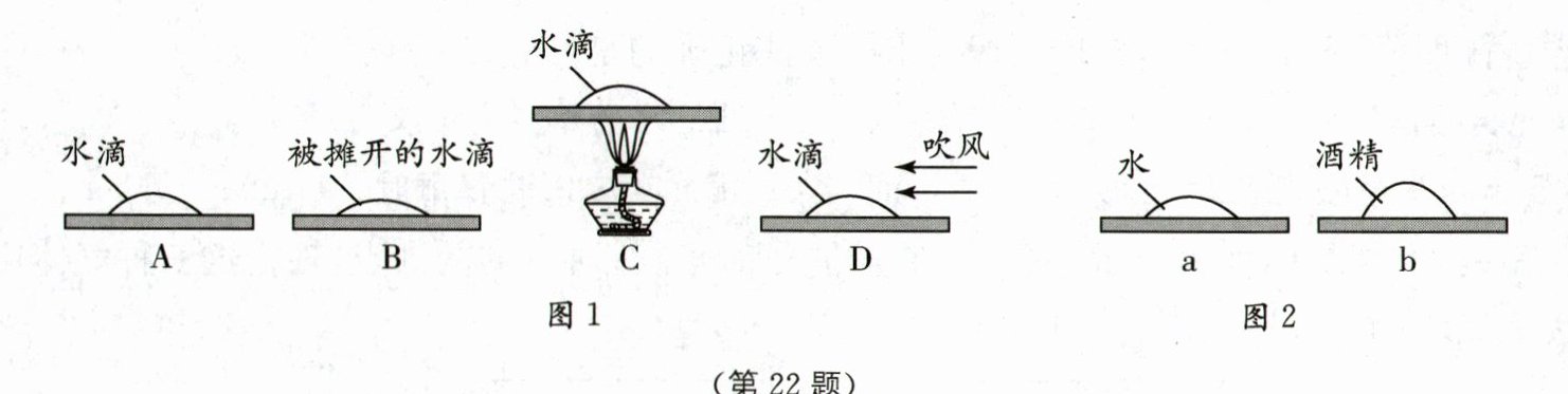 22.(9分)控制变量法 李华同学在4块相同的玻璃板上各滴一滴质量相同的水,进行如图1所示的实验探究,得出水蒸发快慢与水的温度、水的表面积和水面上方空气流动速度有关.