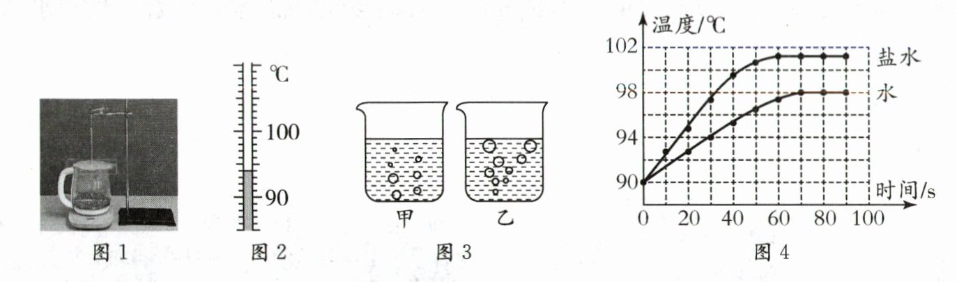 的变化.(2)在水温升高到$90^{\circ }C$后,每隔10 s记录一次温度计的示数,第30 s时温度计示数如图2所示,读数为