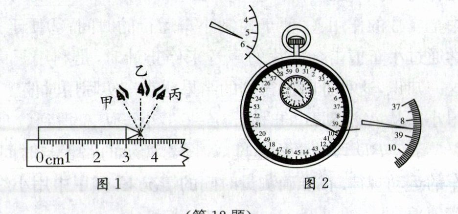 乙 3.50 338.5 [解析]刻度尺读数时,视线要与尺面垂直,由图可知,读数时乙视线与尺面垂直,是正确的,甲和丙视线没有与尺面垂直,是错误的;刻度尺的分度值是1 mm,起始位置对应的刻度值是0.00 cm,末端对应的刻度值是3.50 cm,则物体的长度是3.50 cm;秒表中间小表盘的分度值为0.5 min,分针在5 min与6 min之间偏向6 min一侧,大表盘的分度值为0.1 s,秒表的指针在38.5 s处,所以读数为5 min38.5 s=338.5 s.归纳总结 (1)刻度尺的正确使用方法:①看:使用前先看量程、分度值、零刻度线是否损坏;②放:放正尺的位置,使刻度尺有刻度的一边紧靠被测物体;③读:读数时视线要与尺面垂直,估读到分度值的下一位;④记:记录测量结果时要记上数值和单位.(2)秒表中间的小表盘代表分钟,周围的大表盘代表秒,秒表读数是两个表盘的示数之和.