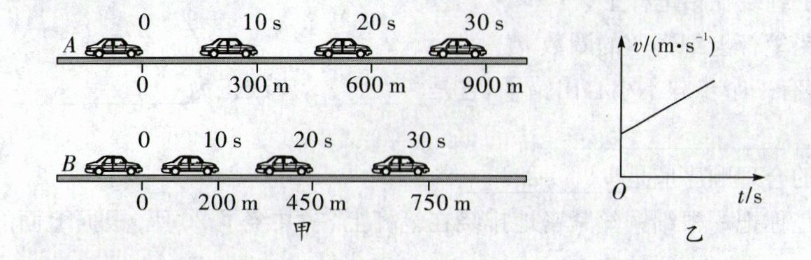 匀速 变速 B [解析]由图甲知,A车在相等时间内,通过的路程相等,故做的是匀速直线运动;B车在相同时间内,通过的路程不相等,且B车频闪照片中两点间距离越来越大,做的是加速直线运动;由图乙所示的v-t图像可知,速度随时间的增大而增大,表示物体做加速直线运动,故这个图像是B车的.