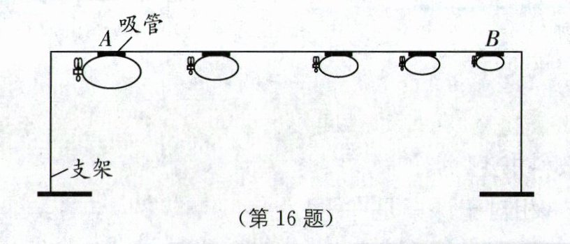 16. 教材P34实践与练习T3·改编 (2025·盐城东台期末)将气球吹大,用夹子把口封紧,剪取一段10 cm长的吸管,用胶带把它固定在气球上.将一根长线穿过吸管,水平拉直后固定在两侧支架上.把气球封口的夹子松开气球向右运动.如图所示,气球运动时每隔0.5 s的频闪照片.以吸管为参照物,支架是