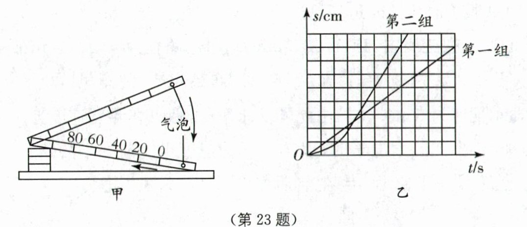 23.(8分)(2025·常州溧阳期末)同学们在“研究气泡的运动速度”.如图甲所示,在长约120 cm的玻璃管中注水近满,上端留一小段空气柱,用橡皮塞塞住管口.先将玻璃管右端抬高,使气泡处在右端.再把右端放到桌面上,测量并记录气泡从点O点运动到20 cm、40 cm、60 cm和80 cm处所用的时间.