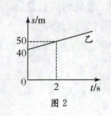 C [解析]由图可知甲车的速度为10m/s,乙车的速度v乙 = s乙/t乙 =(50m - 40m)÷2s = 5m/s,假设甲车追上乙车所用的时间为t,则s甲 = Δs + s乙,即v甲t = Δs + v乙t,代入上式有10m/s×t = 40m + 5m/s×t,解得t = 8s,故A错误;由图可知,乙车在0~2s内运动的路程和时间成正比,即乙车在做匀速运动,故B错误;由计算可知,甲车的速度大于乙车的速度,已知甲、乙两车同时向东运动,所以以乙车为参照物,甲车向东运动,故C正确;正常人步行速度约为1.1m/s,与甲车的速度相差较大,故D错误。
