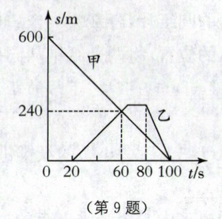 D [解析]0~20s内,乙车的路程为0,说明乙车静止,因此0~60s内,乙车不是一直做匀速直线运动,故A错误;60~80s内,甲乙两车相遇后又分开,故两车之间的距离逐渐变大,故B错误;甲车运动600m所用的时间为100s,甲车的速度为v甲 = s甲/t甲 = 600m÷100s = 6m/s,20~60s内乙车的路程为240m,所以20~100s内,乙车的总路程大于480m,则乙车的平均速度大于v乙 = s乙/t乙 = 480m÷(100s - 20s)= 6m/s,因此乙车的平均速度大于甲车的平均速度,故C错误;80~100s内,乙车做匀速直线运动,运动的路程大于240m,所用的时间为t = 100s - 80s = 20s,则乙车的速度大于v = s/t = 240m÷20s = 12m/s,乙车在80~100s内运动的路程小于s' = 600m - 240m = 360m,则乙的速度小于v' = s'/t' = 360m÷20s = 18m/s,故D正确。
