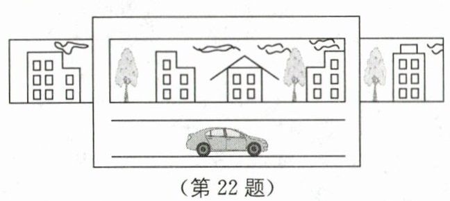 22.(5分)用彩笔在一张窄长的硬纸片上画出房屋、树木和白云作为背景,再在一张宽卡片的下方画上两条横线代表公路,在公路上画一辆车.
