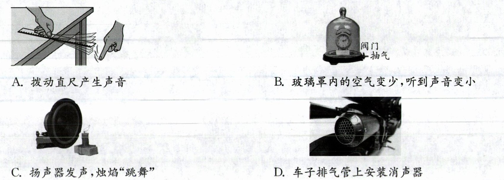 B [解析]拨动直尺产生声音,说明声音是由物体的振动产生的,故A不符合题意;玻璃罩内的空气变少,听到声音变小,说明声音的传播需要介质,故B符合题意;扬声器发声,烛焰"跳舞",说明声音可以传递能量,故C不符合题意;车子排气管上安装消声器,是在声源处减弱噪声,故D不符合题意.