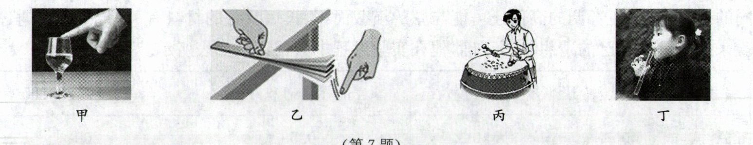 C [解析]用湿手摩擦杯口时,杯子和杯中的水共同振动发声,改变杯中的水量,再次用湿手摩擦杯口时,由于杯子和水的质量改变,振动的频率改变,音调改变,若水减少,则振动频率变大,音调升高,故A错误;拨动钢尺,钢尺振动发声,改变钢尺伸出桌面的长度,钢尺振动的频率改变,音调改变,钢尺伸出桌面越短,振动越快,振动频率越高,音调越高,故B错误;敲鼓时,是鼓面的振动发声,改变用力的大小,会使鼓面振动的幅度改变,从而改变声音的响度,不能改变振动的频率,不能改变音调,故C正确;对着试管口吹气,管内空气柱振动发声,改变管内水量,管内空气柱的长度改变,振动的频率改变,音调改变,增加水量会使空气柱的长度变短,则空气柱的振动频率变大,音调升高,故D错误.