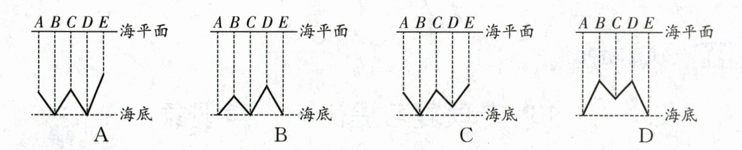 km.(设声波在海水中传播速度为1500 m/s)(5)一艘科考船行驶在某海域,并对该海域的海底形状利用声呐系统进行了测绘:在经过该海域水平面等间距的A、B、C、D、E五个位置时,向海底定向发射超声波,测得回收信号的时间分别为0.30 s、0.16 s、0.30 s、0.14 s、0.30 s.根据时间,求出海底与海平面的距离,就可以绘出海底的大致形状,则该海域海底的大致形状如图