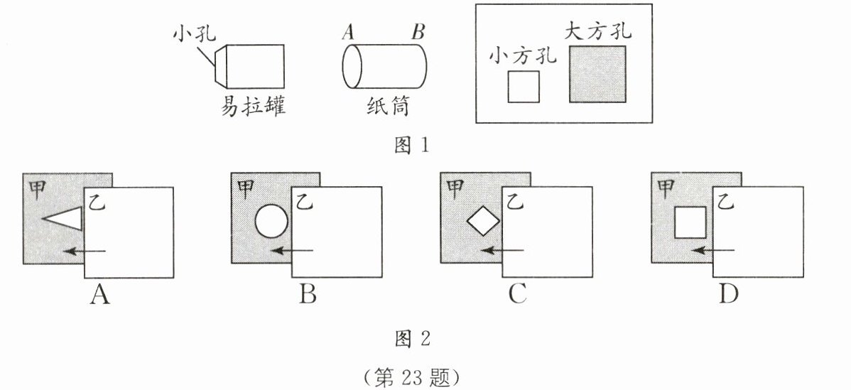 (填"变大""变小"或"不变").(3)正午时,小华在地面上铺一张白纸,将刻有边长为1 cm的小孔的纸板正对着太阳,保持纸板与白纸的距离为30 cm,观察白纸上的光斑.为了研究小孔大小对成像的影响,小明又设计了四种有不同形状孔的卡片甲,并用另一张卡片乙覆盖在甲上.如图2所示.接着,从图示位置沿箭头方向水平移动乙,改变孔的大小,观察光斑形状的变化情况,能满足实验要求的是