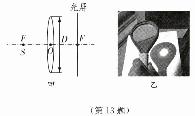 13.(2025·苏州姑苏区期中)小明测焦距时先将凸透镜和光屏的位置固定,如图甲所示,将光源从紧贴凸透镜的位置缓慢向外移动到某一位置,光屏上出现一个与透镜直径相近的光斑,此时固定光源、凸透镜,再将光屏远离透镜,移动的过程中,若光屏上光斑的大小