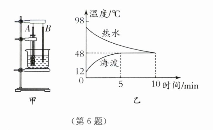 6.水浴法(2024·苏州姑苏区期末)如图甲所示是小明用水浴法探究海波熔化特点的实验装置,根据温度计A和B的示数,绘制了海波和热水的温度随时间变化的图像,如图乙所示.下列说法正确的是(